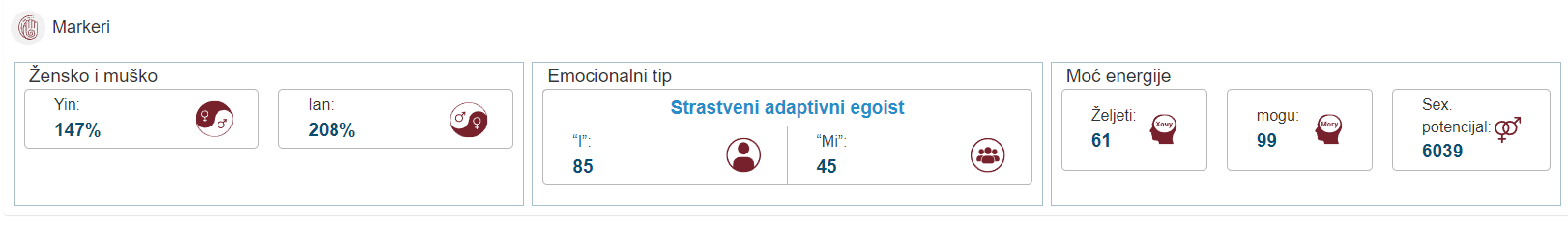 U izvješću možete pronaći Yin -Yang vrijednosti (ženski i muški potencijal). Ove znamenke pokazuju kvalitete koje osoba koristi u životu.Ako Yin premašuje Yang, osoba ima razvijeniji ženski tip ponašanja - mekoću, delikatnost, senzualnost. Ako Yang premašuje Yin, to ukazuje na prevlast muškog tipa ponašanja - krutost, oštrinu, dominaciju.U praksi ove znamenke ne daju mnogo informacija, ali ako postoje oštre neravnoteže, možete pratiti koja vrsta energije nedostaje u osobi - žensko ili muško (idealno bi sve trebalo biti u ravnoteži). U skladu s tim, možete usmjeriti svoje napore prema usklađivanju ovih kvaliteta.