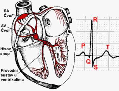 Električki prijenos u AV-čvoru se malo zadrži (0,1 sekund) prije nego brzo ode u ventrikularni mišić. Atriji su električki izolirani od ventrikula vezivnim tkivom, osim u točki (Hisov snop) gdje su vlakna koja provode impuls iz atrija u ventrikul.